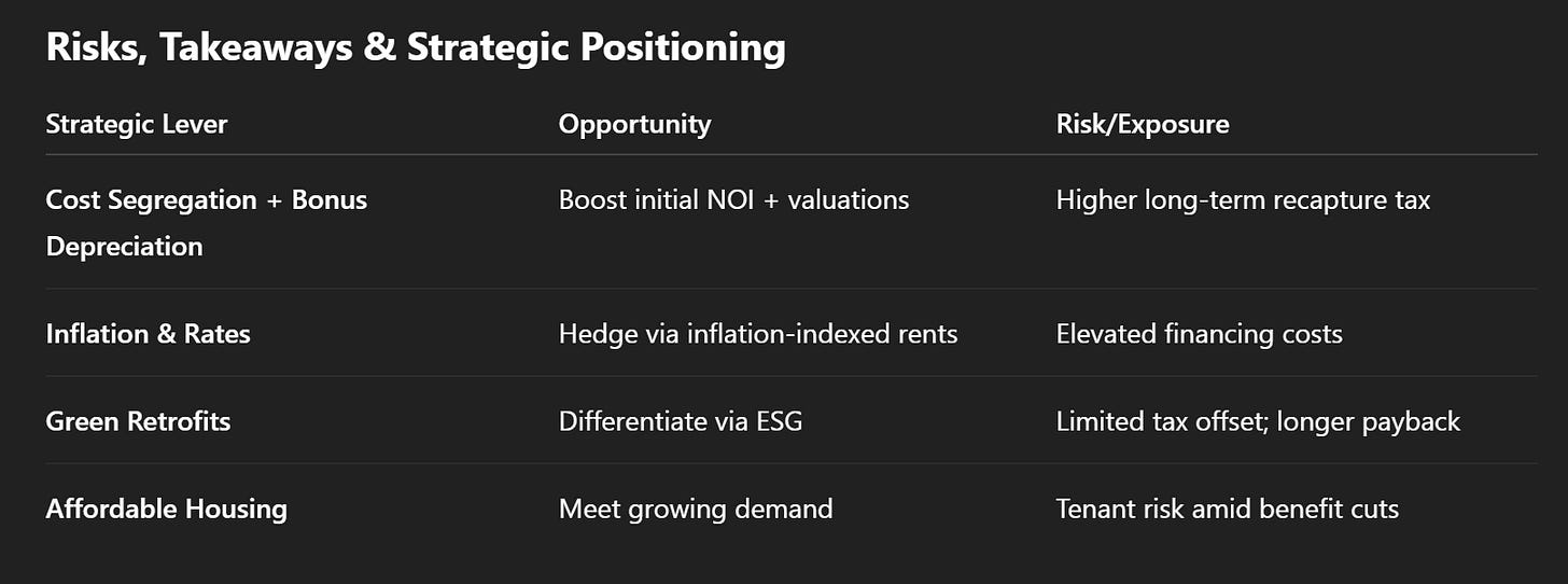 Bottom line: The bill empowers creative financial stuctures that take advantage of new tax levers to minimize tax exposure, but underwriting sensitivities for tenant affordability and sustained debt service are critical and should be on the conservative scale.